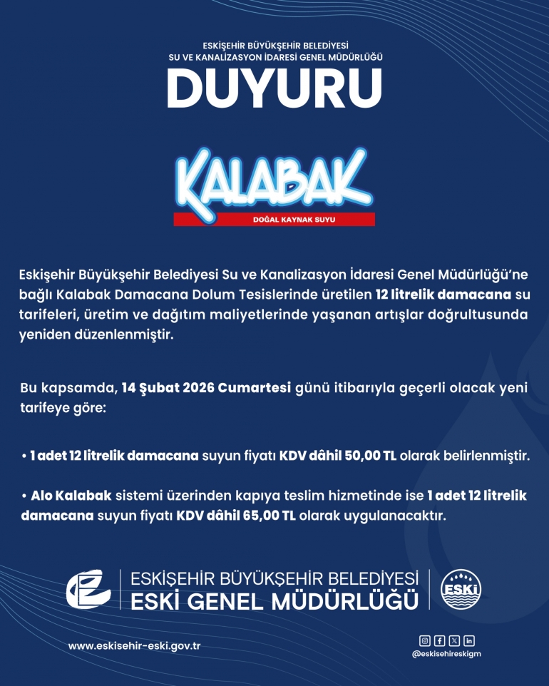 Çevre, Şehircilik ve İklim Değişikliği Bakanlığının Atıksu Altyapı ve Evsel Katı Atık Bertaraf Tesisleri Tarifelerine ilişkin Yönetmeliği kapsamında, ESKİ Genel Müdürlüğü'nce Tepebaşı ve Odunpazarı Belediyeleri adına toplanacak 2024 yılı Evsel Katı Atık Ücreti