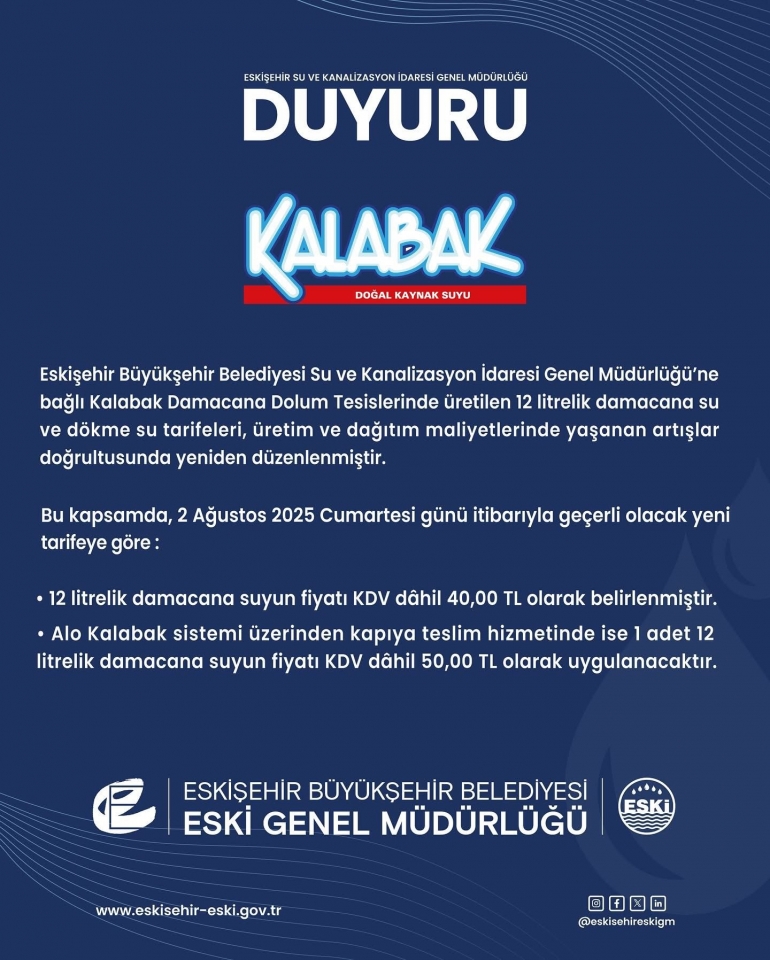Eskişehir Büyükşehir Belediyesi Su ve Kanalizasyon İdaresi Genel Müdürlüğü’ne bağlı Kalabak Damacana Dolum Tesislerinde üretilen 12 litrelik damacana su ve dökme su tarifeleri, üretim ve dağıtım maliyetlerinde yaşanan artışlar doğrultusunda yeniden düzenlenmiştir.