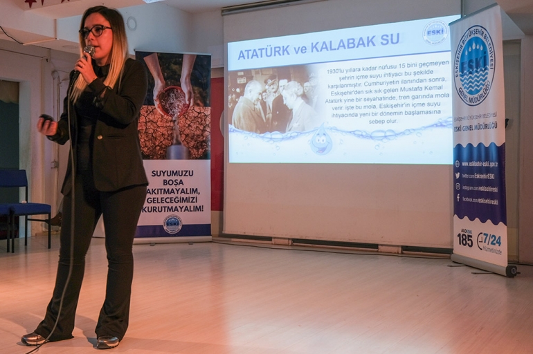 Eskişehir Büyükşehir Belediyesi Su ve Kanalizasyon İdaresi Genel Müdürlüğü (ESKİ) tarafından, Soner Özübek Ortaokulu konferans salonunda 5. sınıf öğrencilerine suyun önemi, bilinçli su kullanımı, su kaynaklarının korunması,içme ve kullanma suyunun hangi aşamalardan geçerek evlerimize ulaştığı konuları anlatıldı. Su ayak izi, yeşil, mavi, ve gri suya da değinilen eğitimde, tekstil ve gıda üretiminde kullanılan su miktarları ile ilgili öğrenciler bilgilendirilirken, su tasarrufunun öneminden bahsedildi.